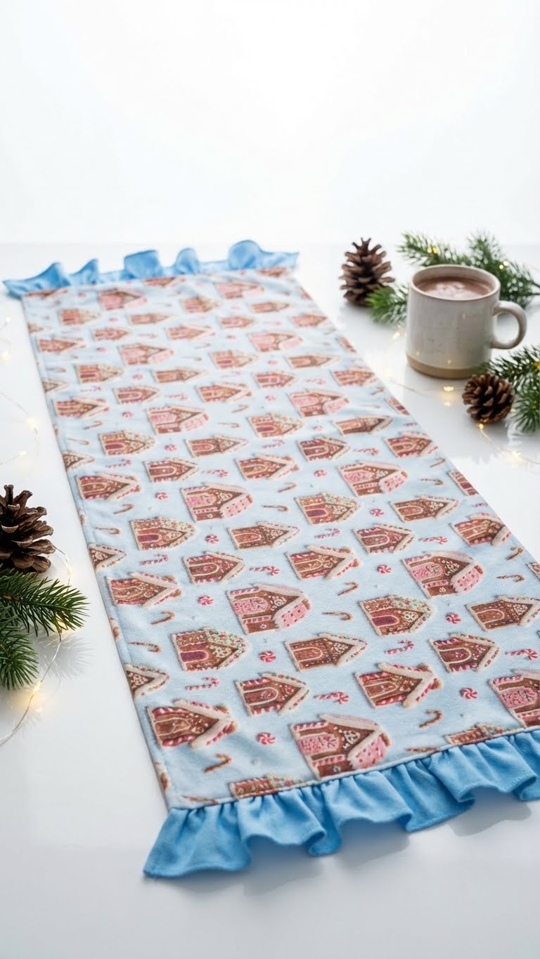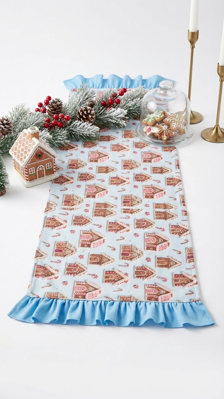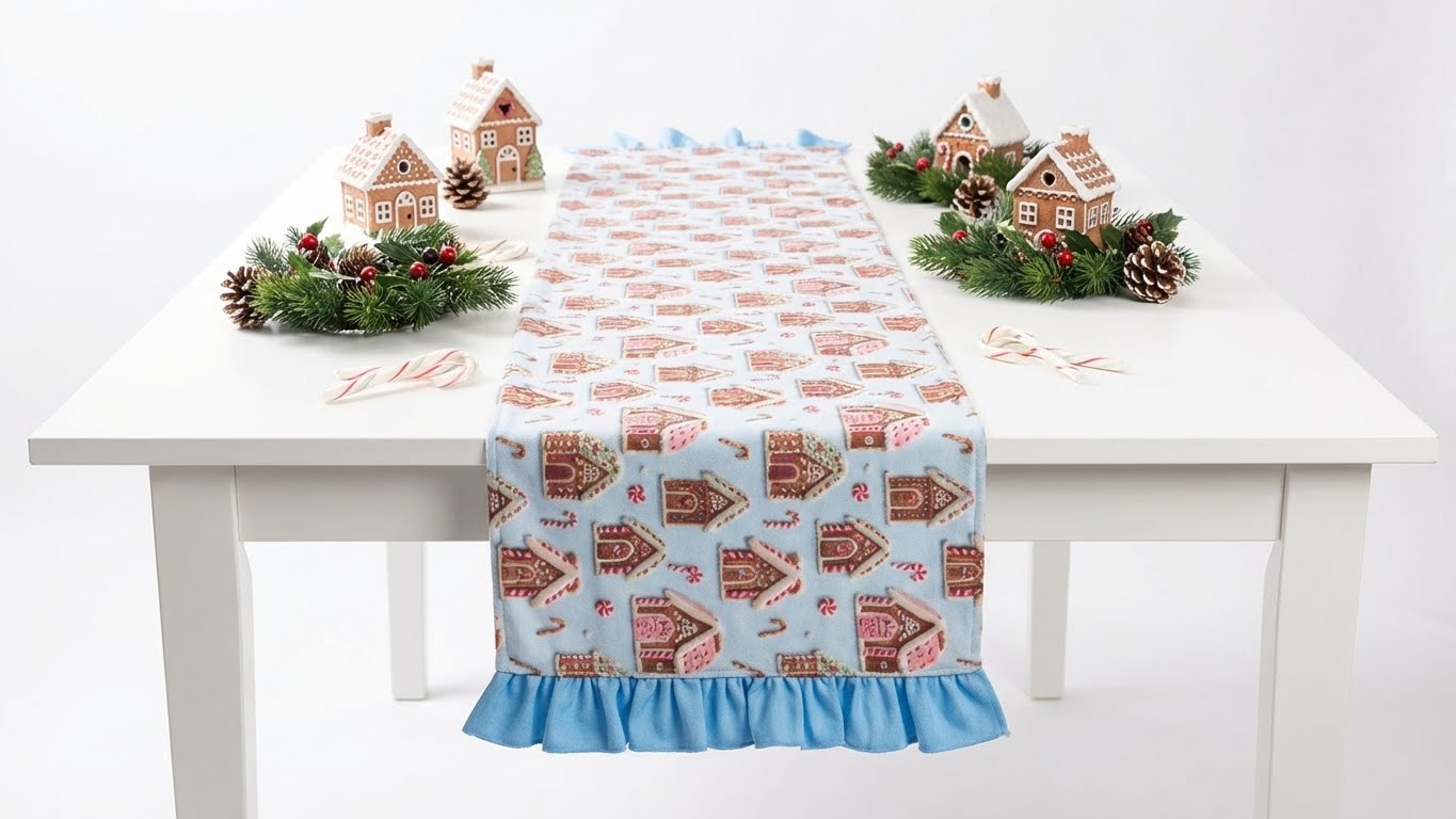 Yılbaşı Desenli Fırfırlı Masa Runner – Gingerbread Ev Temalı Yeni Yıl Masa Örtüsü