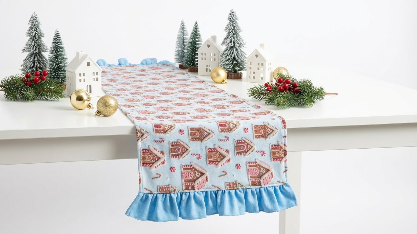 Yılbaşı ruhunu sofralarınıza taşıyan bu özel tasarım masa runner, gingerbread ev desenleri ve yumuşak mavi tonları ile sıcak, şık ve neşeli bir görünüm sunar. Fırfırlı kenar detayı sayesinde masanıza zarif bir hareketlilik katarken, yılbaşı dekorunuzla mükemmel uyum sağlar.