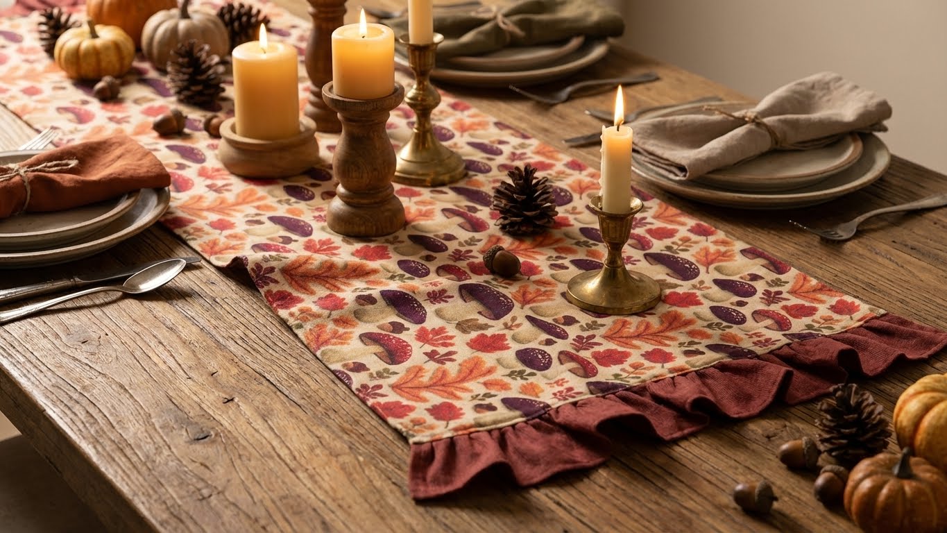 Kumaş üzerindeki detaylı illüstrasyonlar; meşe palamutları, dökülmüş yapraklar ve çeşitli mantar figürleriyle bir masal ormanını andırıyor. Kenarlarındaki büzgülü bordo fırfır detayı ise ürüne vintage ve romantik bir hava katarken, masanıza zengin bir çerçeve oluşturuyor.